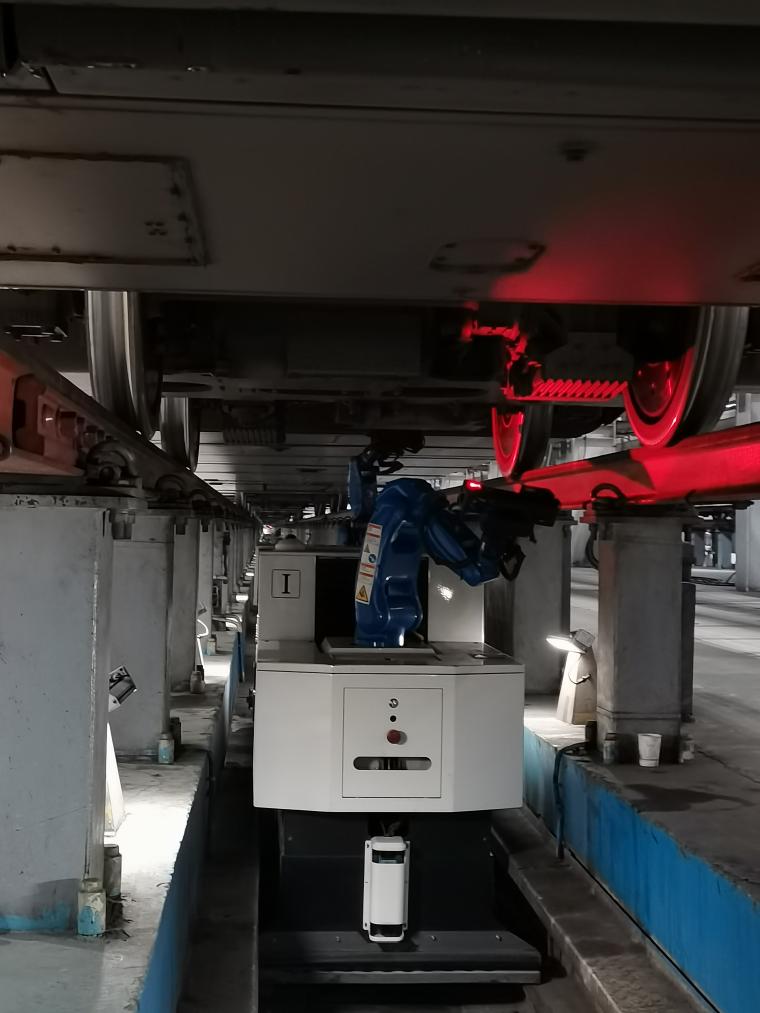 智能检测人采用激光雷达导航及定位技术,两条灵活的机械臂搭载图像采集单元,自动调整高度、角度精确对准动车组车底及关键部件进行快速扫描检测,并在后台智能分析拍照结果。几分钟的工夫,机器人完成了车头部分的信息采集,迅速前往下一节车厢。