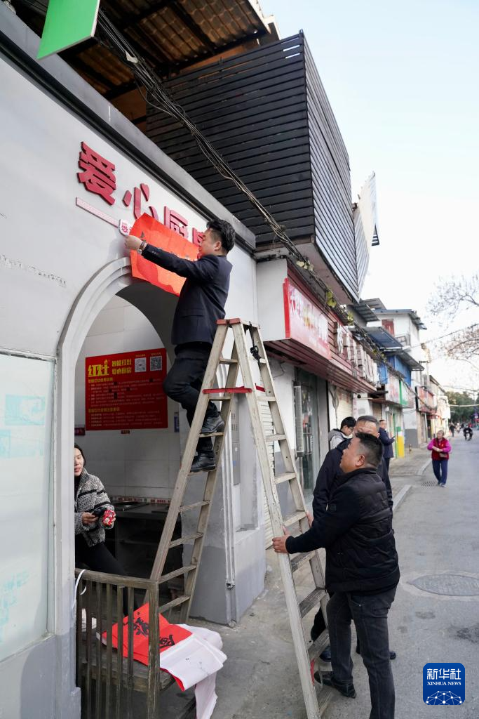 爱心志愿者在厨房的门口贴对联(2025年1月28日摄)。新华社记者 胡晨欢 摄