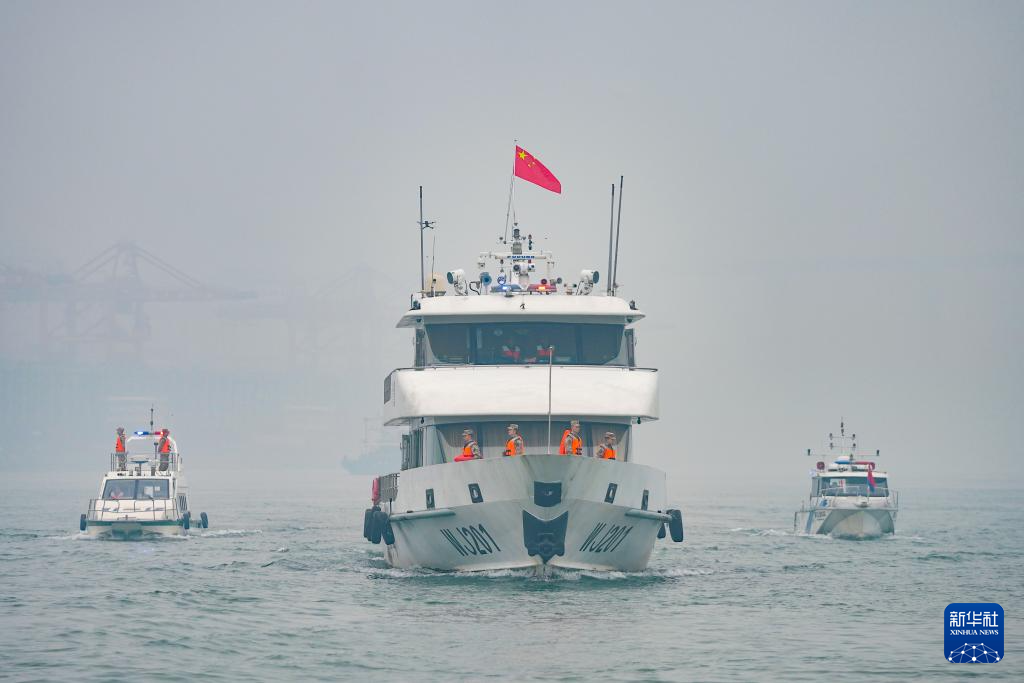 伴随着汽笛声响起,巡逻船艇按照编队顺序驶出码头。