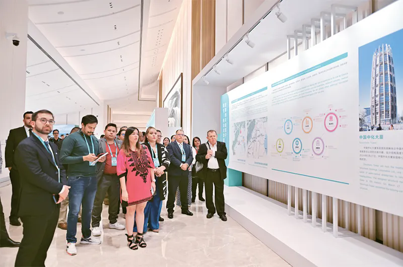 2024年6月27日,由中共中央对外联络部同中共河北省委和雄安新区党工委共同举办的“中国共产党的故事——习近平新时代中国特色社会主义思想在雄安的实践”专题宣介会在雄安新区举行,来自近40个国家的230余名政党领导人或代表现场出席会议。图为当日与会嘉宾在雄安会展中心内参观。新华社记者 牟宇/摄
