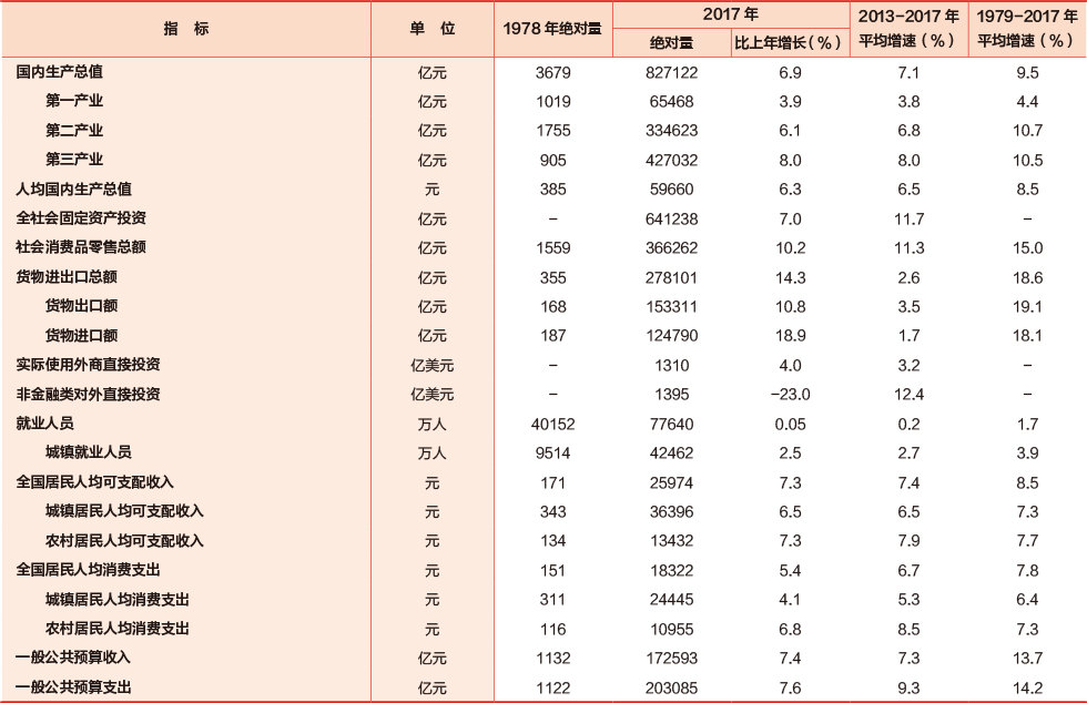 注:國內生產總值增速按可比價計算,2017年國內生產總值總量不等于各產業(yè)之和,是由于數(shù)值修約誤差所致,未做機械調整。固定資產投資、消費品零售總額、一般公共預算收入和支出平均增速按各年增速計算。外商直接投資和對外直接投資、進出口平均增速按現(xiàn)價計算。人均可支配收入、人均消費支出 2017年數(shù)據(jù)來源于全國住戶收支與生活狀況調查,1978年數(shù)據(jù)是根據(jù)歷史數(shù)據(jù)按照新口徑推算獲得,絕對量均按當年價格計算,增速按可比價計算。