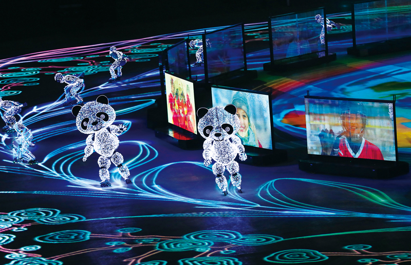 2018年2月25日,在平昌冬奧會(huì)閉幕式“北京8分鐘”表演中,由沈陽新松機(jī)器人自動(dòng)化股份有限公司研發(fā)的智能移動(dòng)機(jī)器人與輪滑演員進(jìn)行表演。 新華社記者 李鋼/攝