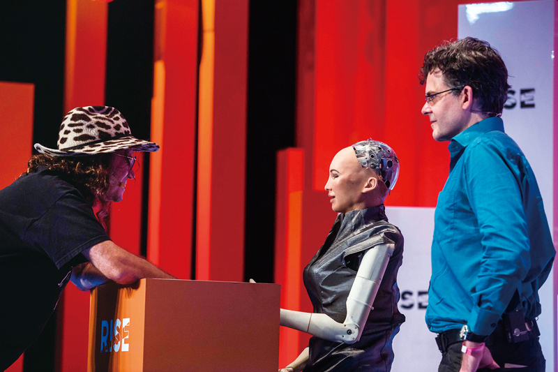 2017年10月,在沙特阿拉伯首都利雅得舉行的“未來投資倡議”大會(huì)上,機(jī)器人索菲亞被授予沙特公民身份,她也因此成為全球首個(gè)獲得公民身份的機(jī)器人。圖為2018年7月10日,在香港會(huì)展中心,機(jī)器人索菲亞亮相主舞臺(tái)。 ISAAC LAWRENCE/視覺中國(guó)