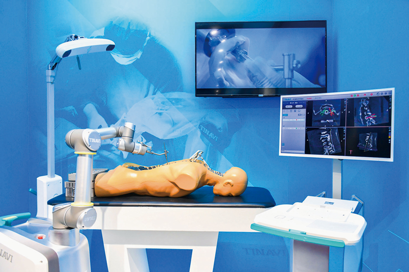 2018年11月22日, 在“偉大的變革——慶祝改革開放40周年大型展覽”上,第三代國(guó)產(chǎn)骨科手術(shù)機(jī)器人“天璣”正在模擬做手術(shù),它是國(guó)際上首個(gè)適應(yīng)癥覆蓋脊柱全節(jié)段和骨盆髖臼手術(shù)的骨科機(jī)器人,性能指標(biāo)達(dá)到國(guó)際領(lǐng)先水平。 麥田/視覺中國(guó)