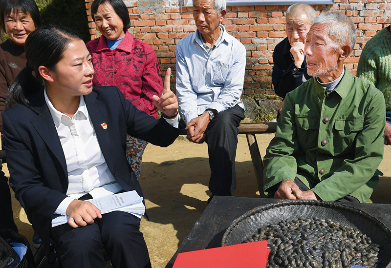 安徽省金寨縣曾走出59位開國將軍,有著“紅軍搖籃、將軍故鄉(xiāng)”的美譽(yù),同時(shí),也是國家級(jí)首批重點(diǎn)貧困縣。2016年4月,習(xí)近平總書記在金寨縣花石鄉(xiāng)大灣村考察脫貧工作時(shí)指出,脫貧攻堅(jiān)已進(jìn)入啃硬骨頭、攻堅(jiān)拔寨的沖刺階段,必須橫下一條心來抓。我們必須堅(jiān)定信心、下定決心,以“三嚴(yán)三實(shí)”的精神,如期打贏脫貧攻堅(jiān)這場(chǎng)硬仗。上圖為2017年10月27日,十九大代表、金寨縣花石鄉(xiāng)大灣村扶貧工作隊(duì)副隊(duì)長余靜(前左)在金寨縣大灣村與村民交流。她說:“大灣村一戶不脫貧,我堅(jiān)決不撤崗?!保ㄐ氯A社發(fā) 陳力/攝)。下圖為2018年4月9日航拍的金寨縣花石鄉(xiāng)大灣村安置點(diǎn),許多貧困戶依靠易地扶貧搬遷、危房改造、宅基地改革等政策,從原來的危房搬進(jìn)了新居(許昊/攝)。