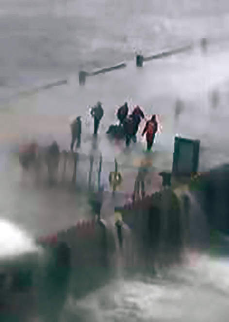 在巨浪的間歇里,他們用叉車推著纜繩一起向碼頭行進,但風浪一陣猛過一陣,推著叉車根本走不動。大家用同一根纜繩串連起來,共同牽挽,依次抓著纜繩,頂著風浪攜手向前,一陣接一陣的狂風大浪不時把人打倒在地,倒下,爬起來,繼續(xù)前行,再倒下,再爬起來,再前行!每向前一步都異常艱難,每向前一步都更加危險,但沒有一個人退縮。