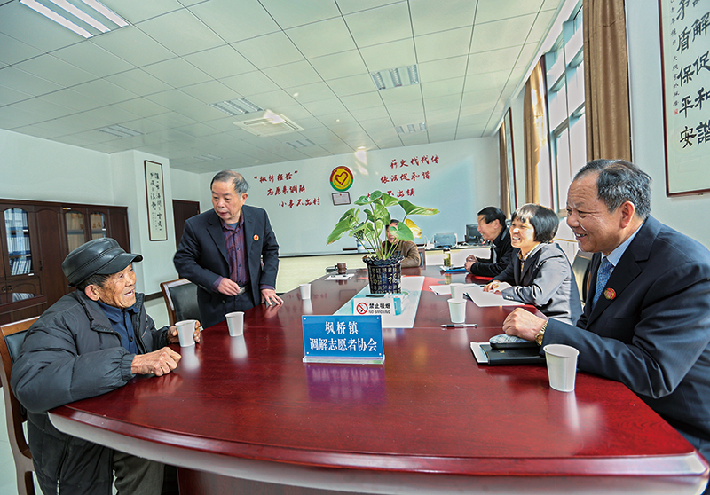 上個世紀60年代初,浙江諸暨楓橋通過發(fā)動和依靠群眾,堅持小事不出村、大事不出鎮(zhèn)、矛盾不上交,就地化解矛盾,實現(xiàn)了“捕人少,治安好”,創(chuàng)造了“楓橋經(jīng)驗”。多年來,“楓橋經(jīng)驗”展現(xiàn)出歷久彌新的魅力,成為全國政法綜治戰(zhàn)線的一面旗幟。圖為諸暨市楓橋鎮(zhèn)楓源村調(diào)解志愿者聯(lián)合會接待室,調(diào)解志愿者正在為與鄰居產(chǎn)生矛盾的村民調(diào)解,一番耐心解釋,這位村民消除了誤會,滿意而歸。 中央政法委宣教局供圖