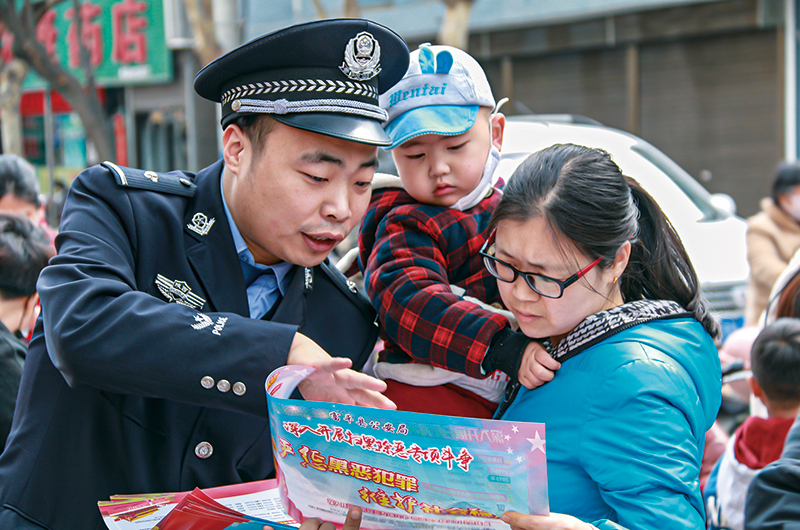 為保障人民安居樂業(yè)、社會安定有序、國家長治久安,進一步鞏固黨的執(zhí)政基礎,政法機關在全國開展了掃黑除惡專項斗爭。 圖為2019年3月13日,陜西省富平縣公安局舉行掃黑除惡專項斗爭“入百店千家萬戶”集中宣傳活動,通過張貼海報、播放專題短片、發(fā)放宣傳資料等形式,向居民宣傳普及掃黑除惡相關法律知識和政策,征集涉黑涉惡案件線索。 中央政法委宣教局供圖