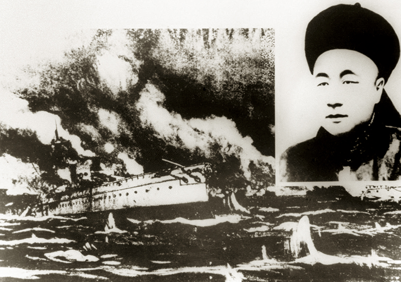 近代以來(lái),面對(duì)列強(qiáng)侵略,在愛(ài)國(guó)主義精神感召下,無(wú)數(shù)愛(ài)國(guó)志士前仆后繼,頑強(qiáng)抗?fàn)帯?894年9月17日,北洋艦隊(duì)與日本海軍在黃海大東溝海面展開(kāi)血戰(zhàn),愛(ài)國(guó)將領(lǐng)鄧世昌(右上)率“致遠(yuǎn)”艦拼死抗敵,并以受傷之艦撞擊敵主力艦“吉野”號(hào),全艦官兵250余人壯烈殉國(guó)。圖為戰(zhàn)斗中的“致遠(yuǎn)”艦。 新華社發(fā)