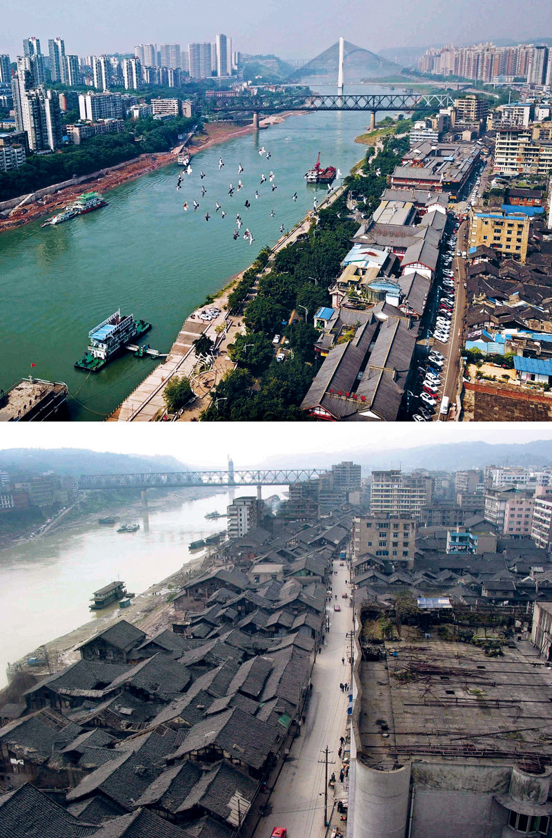四川省宜賓市有“萬里長江第一城”之稱,金沙江、岷江在這里匯合,在長江生態(tài)環(huán)境保護(hù)方面具有特殊的地位。上下圖分別為2018年5月、2012年1月在同一視角拍攝的金沙江兩岸。 新華社發(fā) 曾朗/攝