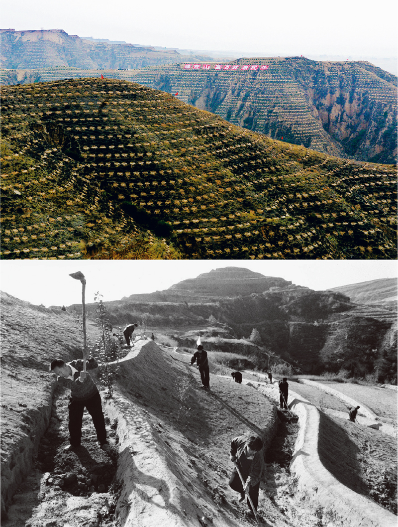 位于呂梁山區(qū)深處的臨汾市大寧縣,地處黃土高原殘?jiān)珳羡謪^(qū),是國家深度貧困縣,又是限制開發(fā)的國家生態(tài)建設(shè)區(qū)。近年來,大寧深入貫徹落實(shí)習(xí)近平生態(tài)文明思想,創(chuàng)新實(shí)施“購買式造林”,生態(tài)環(huán)境大幅改善,在一個戰(zhàn)場同時打贏了生態(tài)治理和脫貧攻堅(jiān)兩場攻堅(jiān)戰(zhàn)。上圖為“綠荒山、富百姓、惠民生”的大規(guī)模造林場景(李明珠/攝)。下圖為上世紀(jì)90年代大寧縣農(nóng)民在田間勞作(新華社記者 馬毅敏/攝)。