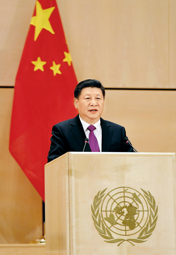 2017年1月18日,國家主席習(xí)近平在瑞士日內(nèi)瓦萬國宮出席“共商共筑人類命運(yùn)共同體”高級別會議,并發(fā)表題為《共同構(gòu)建人類命運(yùn)共同體》的主旨演講。 新華社記者 饒愛民/攝