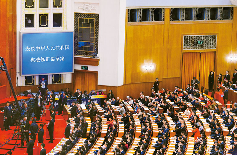 2018年3月11日下午,十三屆全國人大一次會議第三次全體會議表決通過《中華人民共和國憲法修正案》。這次憲法修改,把黨的十九大確定的重大理論觀點和重大方針政策,特別是習近平新時代中國特色社會主義思想載入國家根本法,把黨和人民在實踐中取得的重大理論創(chuàng)新、實踐創(chuàng)新、制度創(chuàng)新成果上升為憲法規(guī)定,體現(xiàn)了黨和國家事業(yè)發(fā)展的新成就新經(jīng)驗新要求,在總體保持憲法的連續(xù)性、穩(wěn)定性、權威性的基礎上推動憲法與時俱進、完善發(fā)展。圖為會議現(xiàn)場。 中新社記者 侯宇/攝