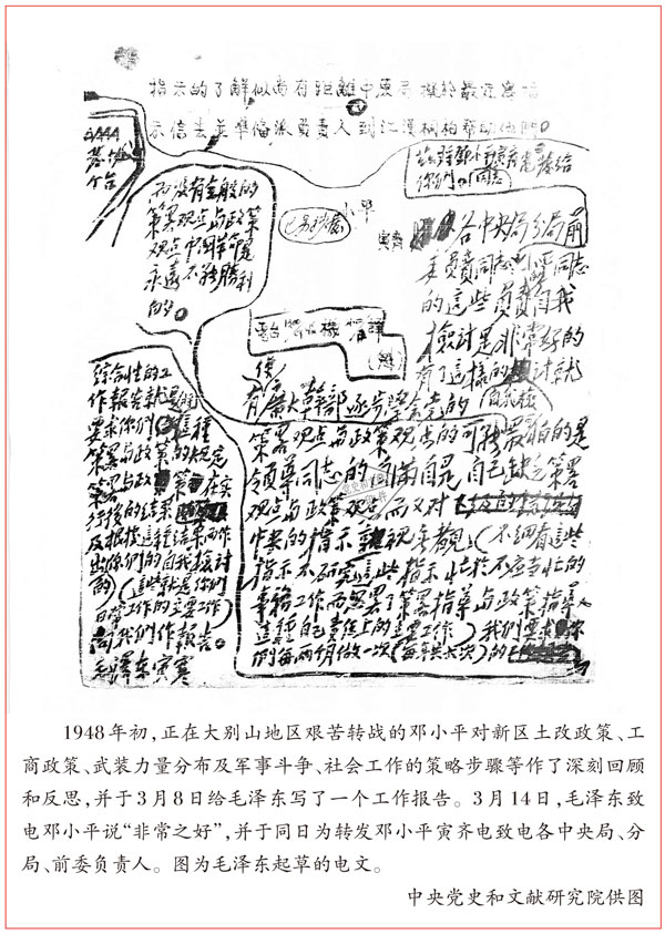 當(dāng)年3月14日,毛澤東在收到鄧小平3月8日關(guān)于新解放區(qū)全盤(pán)的策略與政策問(wèn)題給中共中央的報(bào)告后,批示向各中央局、分局、前委轉(zhuǎn)發(fā)鄧小平的報(bào)告,批語(yǔ)中給予報(bào)告高度評(píng)價(jià),同時(shí)指出:“要求你們每?jī)蓚€(gè)月做一次(每年共六次)的綜合性的工作報(bào)告,就是要求你們將這種策略與政策的規(guī)定、策略與政策在實(shí)行后的結(jié)果及根據(jù)這種結(jié)果而作出的你們的自我檢討(這些就是你們?nèi)粘9ぷ鞯闹饕ぷ鳎┫蛭覀冏鲌?bào)告?!?/p>