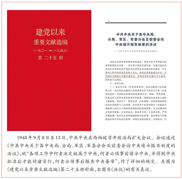 同年9月,毛澤東在西柏坡主持召開(kāi)中共中央政治局會(huì)議,會(huì)議通過(guò)了《中共中央關(guān)于各中央局、分局、軍區(qū)、軍委分會(huì)及前委會(huì)向中央請(qǐng)示報(bào)告制度的決議》(簡(jiǎn)稱(chēng)《決議》)?!稕Q議》就各項(xiàng)工作中何者決定權(quán)屬于中央,何者必須事前請(qǐng)示中央,并得到中央批準(zhǔn)后才能付諸實(shí)行,何者必須事后報(bào)告中央備審,作了詳細(xì)的規(guī)定,從而正式確立了包括綜合報(bào)告和其他各項(xiàng)工作報(bào)告在內(nèi)的一整套完備的請(qǐng)示報(bào)告制度,同時(shí)也明確了黨的各級(jí)組織的權(quán)限和責(zé)任擔(dān)當(dāng)。
