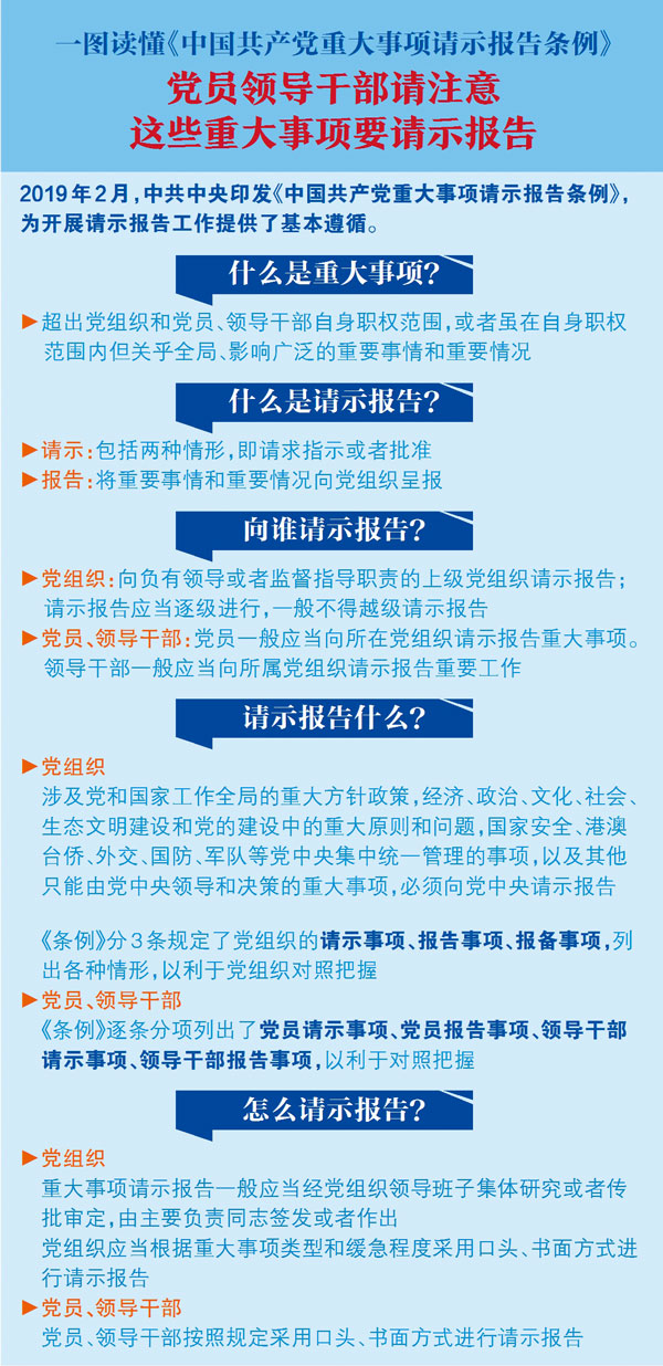 黨的十八大以來(lái),以習(xí)近平同志為核心的黨中央高度重視加強(qiáng)請(qǐng)示報(bào)告工作。習(xí)近平總書(shū)記反復(fù)強(qiáng)調(diào)嚴(yán)格執(zhí)行請(qǐng)示報(bào)告制度的重要性,明確要求全黨必須嚴(yán)格執(zhí)行重大問(wèn)題請(qǐng)示報(bào)告制度,研究涉及全局的重大事項(xiàng)或作出重大決定要及時(shí)向黨中央請(qǐng)示報(bào)告,執(zhí)行黨中央重大決定的情況要專(zhuān)題報(bào)告。2019年初,黨中央頒布了《中國(guó)共產(chǎn)黨重大事項(xiàng)請(qǐng)示報(bào)告條例》,這是在新形勢(shì)下對(duì)歷史上黨的報(bào)告制度的繼承和發(fā)展。這一條例與《關(guān)于新形勢(shì)下黨內(nèi)政治生活的若干準(zhǔn)則》、《中共中央政治局關(guān)于加強(qiáng)和維護(hù)黨中央集中統(tǒng)一領(lǐng)導(dǎo)的若干規(guī)定》等黨內(nèi)法規(guī)一起,構(gòu)成加強(qiáng)黨的政治建設(shè)的黨內(nèi)制度體系,表明了我們黨對(duì)于維護(hù)黨的集中統(tǒng)一領(lǐng)導(dǎo)有了更全面、更深入的認(rèn)識(shí)和更系統(tǒng)、更有效的辦法。