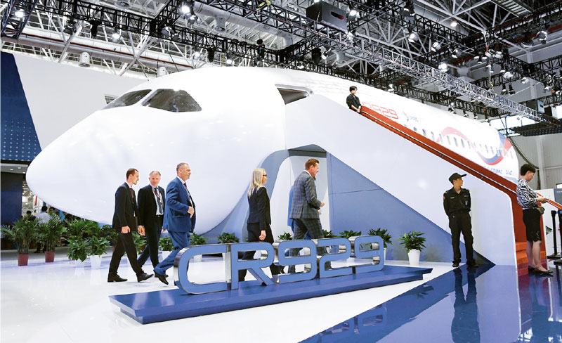 2018年11月7日,中俄聯(lián)合研制的遠(yuǎn)程寬體客機(jī)CR929的1︰1樣機(jī)亮相第十二屆中國國際航空航天博覽會(huì)。 新華社記者 梁旭/攝