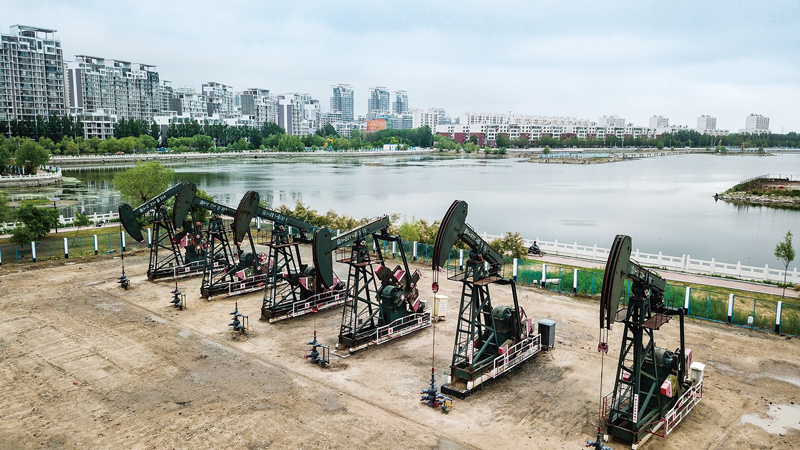 經(jīng)過半個多世紀(jì)艱苦創(chuàng)業(yè),大慶油田不僅扛起了“共和國加油機”的神圣職責(zé),為保障國家能源安全作出巨大貢獻,而且著力打造了一座人與自然和諧相處、原油生產(chǎn)與環(huán)境保護相得益彰的“綠色油化之都”。圖為大慶油田叢式井坐落在市區(qū)燕都湖旁。 新華社記者 王建威/攝