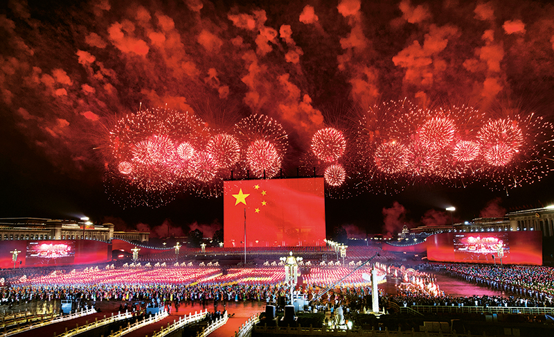 2019年10月1日晚,慶祝中華人民共和國成立70周年聯(lián)歡活動在北京天安門廣場盛大舉行。圖為巨幅國旗升起時與滿天焰火禮花交相輝映的盛況。 李舸/攝
