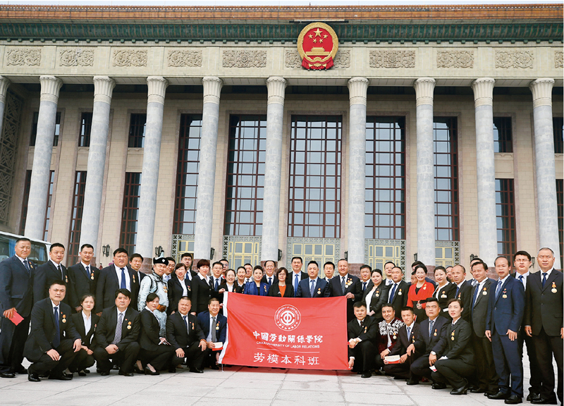 2018年“五一”國際勞動節(jié)前,中國勞動關(guān)系學(xué)院勞模本科班全體學(xué)員給習(xí)近平總書記寫信,匯報學(xué)習(xí)習(xí)近平新時代中國特色社會主義思想的體會,表達(dá)了當(dāng)好主人翁、建功新時代的決心。4月30日,習(xí)近平總書記給學(xué)員們回信,勉勵他們珍惜榮譽(yù)、努力學(xué)習(xí),繼續(xù)拼搏、再創(chuàng)佳績。圖為2019年4月23日,參加“五一”國際勞動節(jié)暨全國五一勞動獎和全國工人先鋒號表彰大會的中國勞動關(guān)系學(xué)院勞模本科班學(xué)員代表合影。 工人日報記者 楊登峰/攝