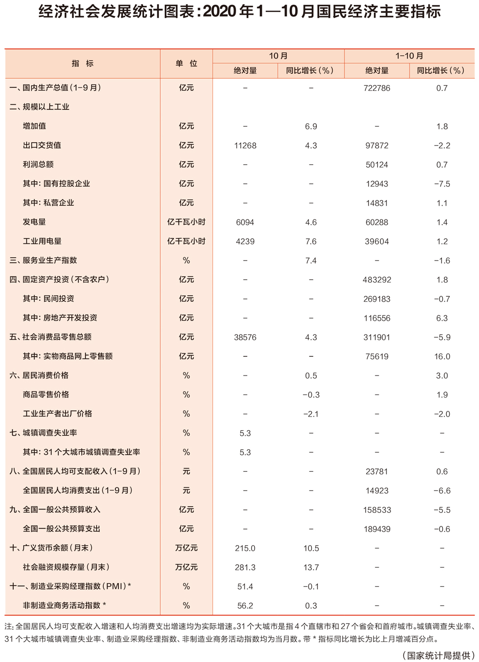 經(jīng)濟社會發(fā)展統(tǒng)計圖表:2020年1—10月國民經(jīng)濟主要指標