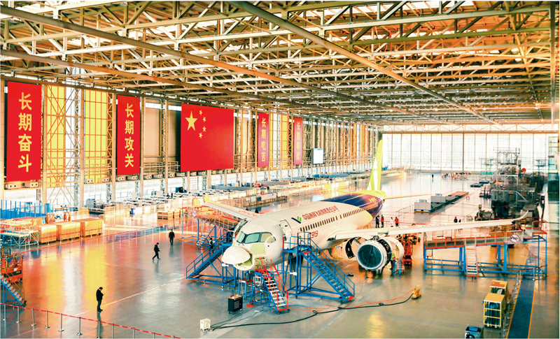 大型客機(jī)是航空制造的“高端產(chǎn)品”,因其技術(shù)集成要求高、生產(chǎn)工藝十分復(fù)雜等因素,歷來(lái)是檢驗(yàn)一個(gè)國(guó)家航空制造業(yè)綜合實(shí)力和水平的“試金石”。從2007年正式立項(xiàng),到2010年展出樣機(jī),再到2015年總裝下線,2017年完成首飛,C919大型客機(jī)一路走來(lái),見(jiàn)證了我國(guó)航空工業(yè)自主創(chuàng)新的奮進(jìn)歷程,成為中國(guó)制造轉(zhuǎn)型升級(jí)、邁向中高端的生動(dòng)縮影。圖為位于中國(guó)商飛總裝制造中心浦東基地的C919大型客機(jī)總裝廠房。 浦東新區(qū)區(qū)委宣傳部供圖