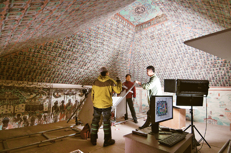 2015年5月6日,敦煌研究院文物數(shù)字化研究所的工作人員在莫高窟第205窟進(jìn)行數(shù)字化作業(yè)。 敦煌研究院供圖