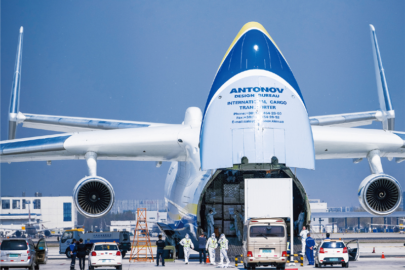 疫情以來,中國發(fā)起了新中國成立以來規(guī)模最大的全球人道主義行動,向多國提供了口罩2000多億只、防護(hù)服20億件、檢測試劑盒8億份,承擔(dān)起全球抗疫物資最大供應(yīng)國的責(zé)任,有力支持全球疫情防控。圖為2020年4月13日,全球最大運(yùn)輸機(jī)AN225在天津?yàn)I海國際機(jī)場裝載國際防疫物資。 中新社記者 佟郁/攝