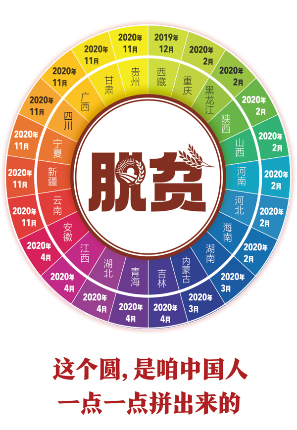 2020年11月23日,貴州省宣布最后9個(gè)貧困縣退出貧困縣序列。至此,國務(wù)院扶貧辦確定的全國832個(gè)貧困縣全部脫貧摘帽。這是22個(gè)省份宣布貧困縣“清零”的時(shí)間示意圖。 央視新聞供圖