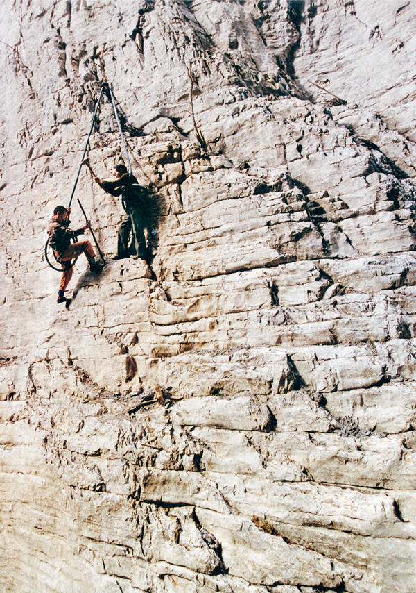 然而,在絕壁上開出一條天路,遠(yuǎn)比想象的更加艱難。沒有工具,毛相林和村民們就腰系長繩,用大錘、鋼釬、簸箕等簡單的農(nóng)具懸在空中鉆炮眼;沒有任何保護(hù)措施,他們?cè)凇罢艘慌凇钡拇怪鄙襟w上,將炸開的缺口作為“立足之地”,用手挖,用腳蹬;高山絕壁沒有人家,他們就住山頂、喝泉水、睡山洞。為早日修通絕壁路,毛相林最長一次在工地駐扎了3個(gè)月沒回家。他說,我是修路發(fā)起人,最重的活、最危險(xiǎn)的活必須帶頭。就像螞蟻啃骨頭一樣,毛相林帶領(lǐng)著下莊村人,在懸崖上艱難地一寸一寸向前推進(jìn)。