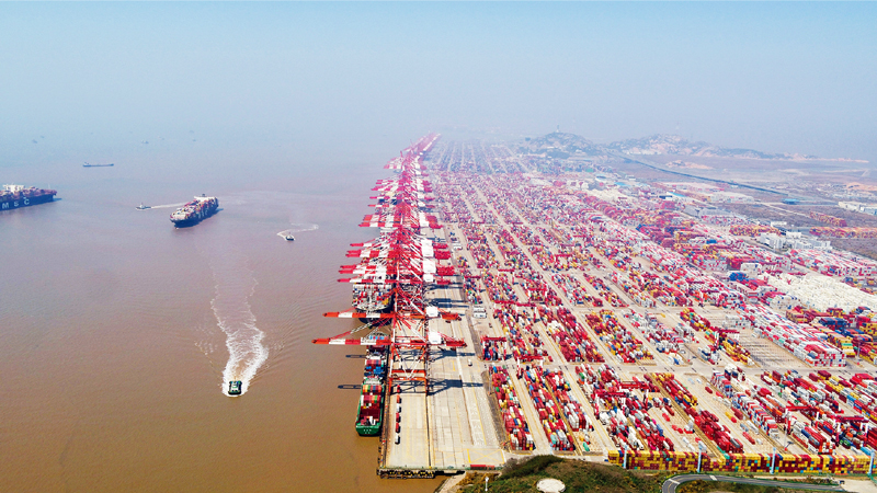 在“綠水青山就是金山銀山”理念指引下,長江經(jīng)濟(jì)帶各地進(jìn)一步加強(qiáng)環(huán)境保護(hù)、完善基礎(chǔ)設(shè)施、推進(jìn)協(xié)調(diào)發(fā)展、擴(kuò)大對外開放,共同奏響高質(zhì)量發(fā)展新樂章。圖為2020年3月18日上海洋山港集裝箱碼頭。 新華社記者 丁汀/攝