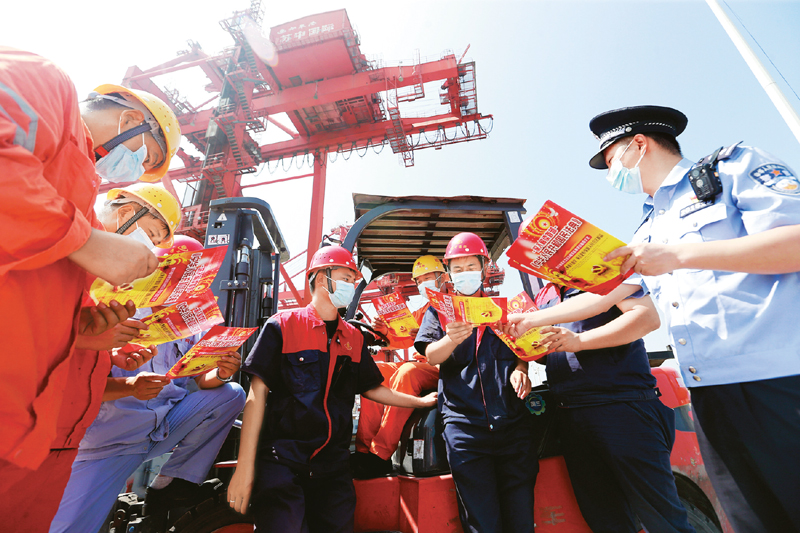 2020年8月19日,江蘇省如皋市出入境邊防檢查站組織普法民警來到蘇中國際碼頭開展“關(guān)注民法典 護(hù)航美好生活”主題宣傳活動(dòng)。 中新社發(fā) 章善玉/攝