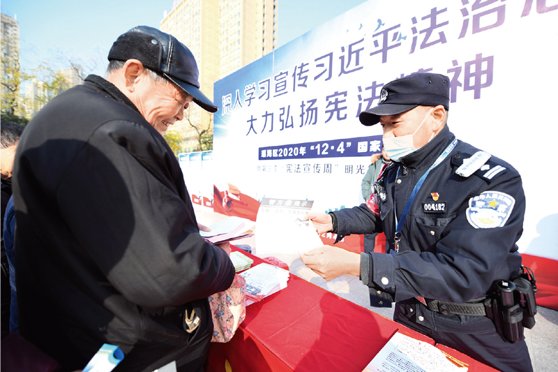 2020年12月4日,在第七個(gè)“國家憲法日”,安徽省合肥市開展“深入學(xué)習(xí)宣傳習(xí)近平法治思想,大力弘揚(yáng)憲法精神”主題宣傳活動(dòng)。 中新社發(fā) 瑤海駿馬/攝