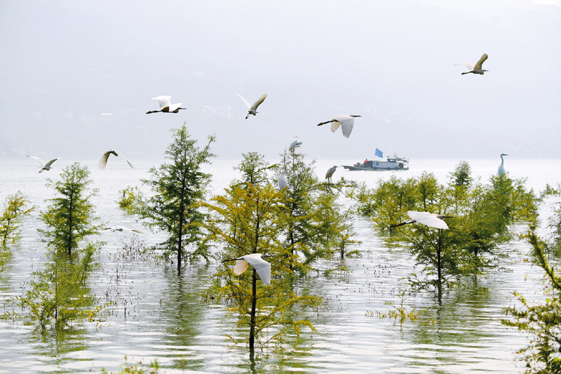 人民法院認(rèn)真貫徹落實(shí)習(xí)近平生態(tài)文明思想,努力為生態(tài)文明建設(shè)與綠色發(fā)展提供優(yōu)質(zhì)司法服務(wù)。在長(zhǎng)江三峽庫區(qū),為解決庫區(qū)消落帶植物存活的治理難題,重慶法院引進(jìn)了耐淹耐旱的中山杉。圖為重慶法院長(zhǎng)江三峽庫區(qū)生態(tài)修復(fù)司法保護(hù)示范林的中山杉在水庫蓄水時(shí)被部分淹沒的景象。 最高人民法院供圖