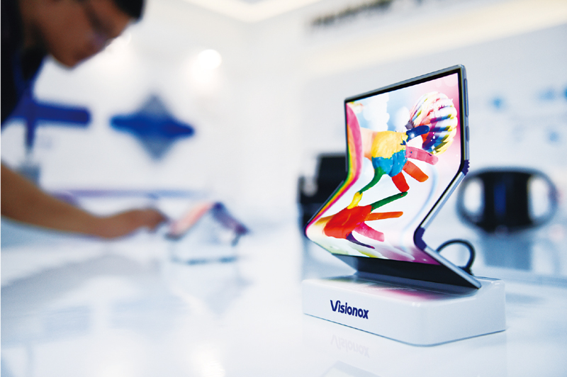 AMOLED柔性顯示屏具有自發(fā)光、高分辨率、響應(yīng)速度快、可實現(xiàn)彎曲的特點,可廣泛應(yīng)用于手機、電腦、可穿戴設(shè)備等終端產(chǎn)品。圖為維信諾(合肥)第六代全柔AMOLED生產(chǎn)線建設(shè)工程展廳內(nèi)陳列的柔性顯示屏產(chǎn)品?!“不杖請笥浾?徐旻昊/攝