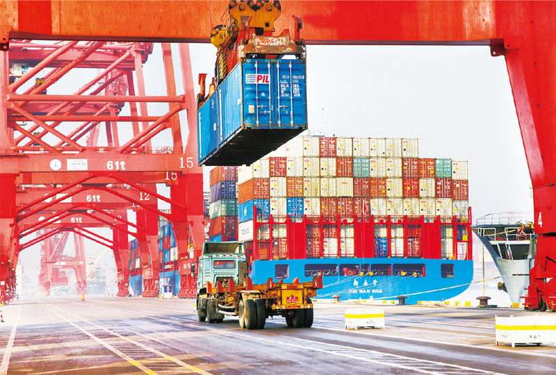 開放是國家繁榮發(fā)展的必由之路?!笆奈濉睍r(shí)期,要堅(jiān)持實(shí)施更大范圍、更寬領(lǐng)域、更深層次對外開放,開拓合作共贏新局面。圖為2021年1月14日,在江蘇連云港港集裝箱碼頭,大型機(jī)械正在從集裝箱船舶上卸載貨物?!∪嗣駡D片 王健民/攝