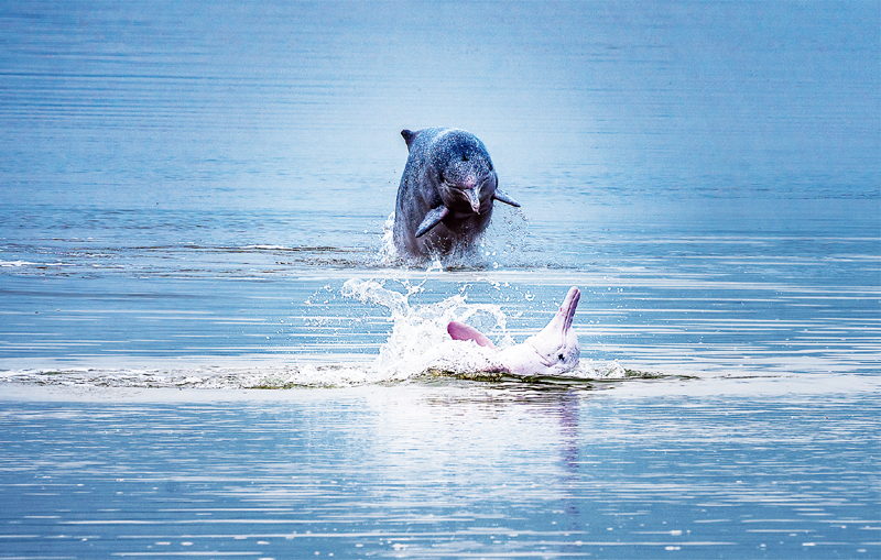 生態(tài)文明建設(shè)是關(guān)系中華民族永續(xù)發(fā)展的千年大計(jì)。“十四五”時(shí)期,要推動綠色發(fā)展,促進(jìn)人與自然和諧共生。圖為2021年3月1日,福建省霞浦縣鹽田鄉(xiāng)南灣村海域,兩只國家一級保護(hù)野生動物——中華白海豚在近海嬉戲玩耍、翻滾跳躍?!∪嗣駡D片 鄭培鑾/攝