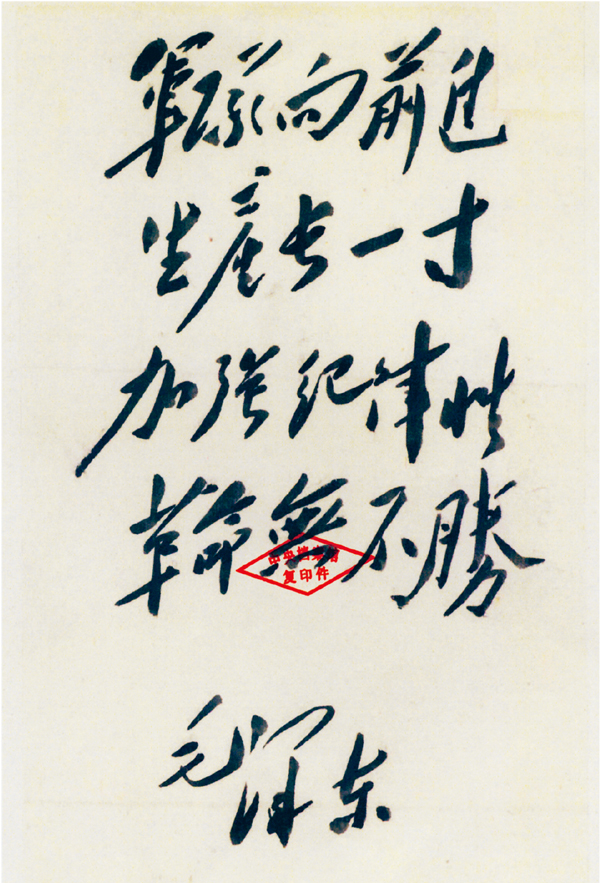 毛澤東在電報(bào)中指出,再有一年左右時(shí)間即可從根本上打倒國民黨。但毛澤東同時(shí)又告誡:“要全部解決國民黨并占領(lǐng)全國,則尚須要更多的時(shí)間。我黨我軍仍須穩(wěn)步前進(jìn),不驕不躁,以求全勝。我們的口號是:‘軍隊(duì)向前進(jìn),生產(chǎn)長一寸,加強(qiáng)紀(jì)律性,革命無不勝?!?/p>