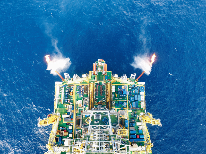 我國(guó)加快發(fā)展新能源和可再生能源,能源消費(fèi)結(jié)構(gòu)不斷優(yōu)化。2020年,我國(guó)率先實(shí)現(xiàn)水平井鉆采深?!翱扇急?。圖為我國(guó)海域天然氣水合物第二輪試采平臺(tái)“藍(lán)鯨2號(hào)”噴出雙火焰(2020年3月25日攝)。 新華社發(fā) 廣州海洋地質(zhì)調(diào)查局供圖