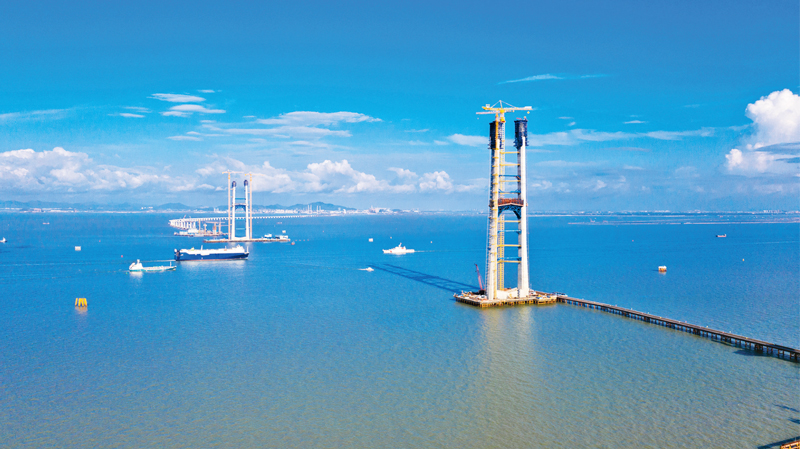 廣東堅(jiān)持把基礎(chǔ)設(shè)施互聯(lián)互通作為城市群建設(shè)的先導(dǎo)工程,加快推進(jìn)“軌道上的大灣區(qū)”和跨境基礎(chǔ)設(shè)施建設(shè)。深中通道是聯(lián)系珠江口東西兩岸的直聯(lián)通道,是粵港澳大灣區(qū)的又一重要交通大動脈。圖為2021年5月16日,深圳深中通道伶仃洋大橋270米主塔建設(shè)正在進(jìn)行中。 人民圖片 吳宙/攝