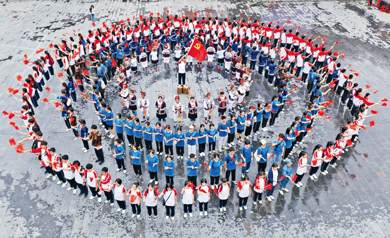 廣西柳州三江侗族自治縣采用群眾喜聞樂見的方式方法,把紅色資源作為生動教材,推動黨史學(xué)習(xí)教育深入群眾、深入基層、深入人心。圖為2021年5月17日,當(dāng)?shù)厝罕娫诤铣稕]有共產(chǎn)黨就沒有新中國》。 人民視覺 龔普康/攝