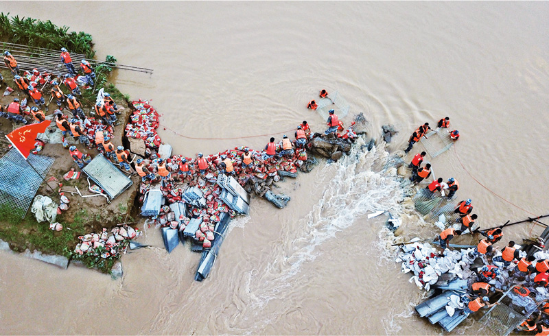 2021年7月,河南多地遭遇持續(xù)強(qiáng)降雨后,駐豫部隊(duì)爭分奪秒投入防汛搶險(xiǎn)和災(zāi)后重建,盡最大努力保障人民生命財(cái)產(chǎn)安全,盡快恢復(fù)百姓生產(chǎn)生活秩序。圖為空降兵某旅官兵用石塊、沙袋構(gòu)筑子堤。 余紅春/攝