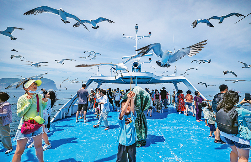 我國正通過增強居民消費能力,改善消費環(huán)境,提振汽車、家電等大宗消費,擴大綠色消費,拓展服務消費,積極挖掘內潛力。圖為2021年7月21日,在山東榮成海驢島外碼頭,游客們登上游艇,感受海風清涼、喂食黑尾鷗,盡享夏日休閑好時光。 人民圖片 李信君/攝