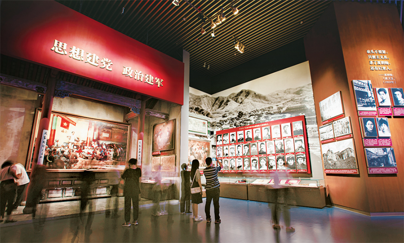 1929年12月,中共紅四軍第九次代表大會在福建上杭古田召開,古田會議確立了思想建黨、政治建軍的根本原則。圖為2021年7月19日,在參觀中國共產(chǎn)黨歷史展覽館舉行的“‘不忘初心、牢記使命’中國共產(chǎn)黨歷史展覽”時,觀眾在油畫《古田會議》前駐足?!⑿挛?攝