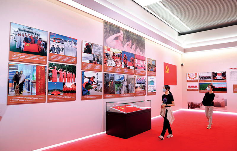 為慶祝中國共產(chǎn)黨成立100周年,2021年7月8日,“讓黨中央放心、讓人民群眾滿意——新時代中央和國家機關(guān)黨的建設(shè)成就巡禮展”在國家博物館開幕。展覽以貫徹落實習(xí)近平總書記在中央和國家機關(guān)黨的建設(shè)工作會議上的重要講話精神為主線,通過2700余幅圖片、185件實物、3000余冊圖書,生動展現(xiàn)了黨的十八大以來中央和國家機關(guān)黨建取得的顯著成績和深刻變化。圖為7月11日,觀眾在該展覽參觀?!≈行律绨l(fā) 陳曉根/攝
