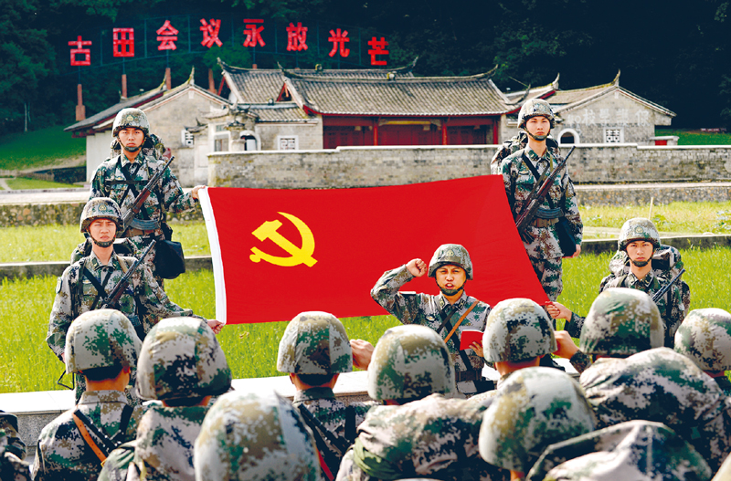 1929年12月,中國共產(chǎn)黨紅軍第四軍第九次代表大會在福建省上杭縣古田召開。古田會議確立了思想建黨、政治建軍的根本原則,對人民軍隊(duì)的建設(shè)產(chǎn)生了深遠(yuǎn)影響。圖為某部隊(duì)官兵在古田會議舊址前莊嚴(yán)宣誓,賡續(xù)紅色血脈,擔(dān)當(dāng)強(qiáng)軍重任。 姚安泉/攝
