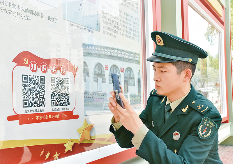 火箭軍某旅通過多種方式開展黨史學(xué)習(xí)教育。圖為2021年3月24日,一名戰(zhàn)士用手機(jī)掃描文化櫥窗里的黨史知識鏈接二維碼。 范文佳/攝
