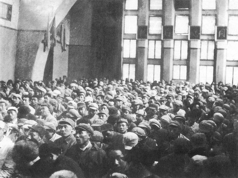 1945年4月至6月,黨的七大在延安楊家?guī)X中央大禮堂召開。主席臺上方的橫幅“在毛澤東的旗幟下勝利前進”,同會場后面的題詞“同心同德”,烘托出會議的主題。黨的七大使全黨在馬克思列寧主義、毛澤東思想的基礎上達到空前的團結。圖為七大會場(資料圖片)。
