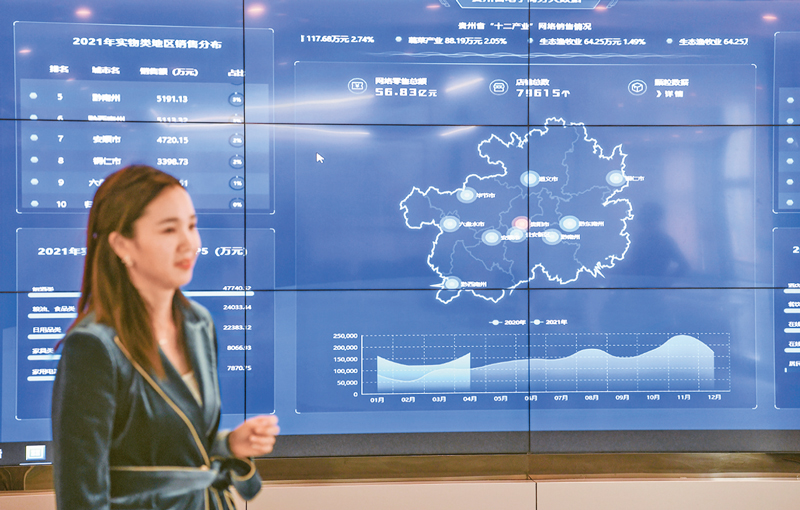 作為國家大數(shù)據(jù)綜合試驗區(qū),2020年,貴州數(shù)字產(chǎn)業(yè)化、產(chǎn)業(yè)數(shù)字化步伐加快,數(shù)字經(jīng)濟增速連續(xù)6年全國第一,增速超過15%。大數(shù)據(jù)對貴州推動經(jīng)濟發(fā)展、提高生產(chǎn)力的乘數(shù)效應(yīng)日益嶄露。2021年5月26日至28日,2021中國國際大數(shù)據(jù)產(chǎn)業(yè)博覽會在貴陽舉辦。圖為5月27日,工作人員在介紹“一碼貴州”數(shù)據(jù)平臺網(wǎng)絡(luò)銷售情況。 新華社記者 楊文斌/攝