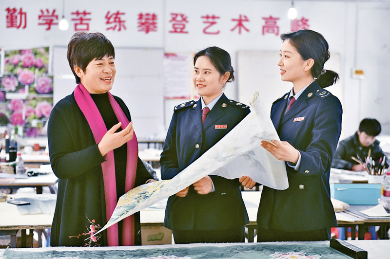 山東省菏澤市巨野縣依托“菏澤牡丹”的資源優(yōu)勢,著力打造工筆牡丹畫文化產業(yè),鞏固脫貧攻堅成果,有序推進鄉(xiāng)村振興。圖為2021年3月20日,巨野縣稅務局“稅收專家顧問團”成員上門走訪,在魯西書畫院向院長徐鳳秋(左)介紹針對工筆牡丹畫產業(yè)的減稅降費優(yōu)惠政策。 新華社記者 郭緒雷/攝